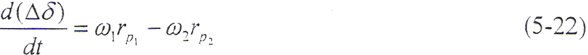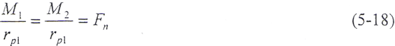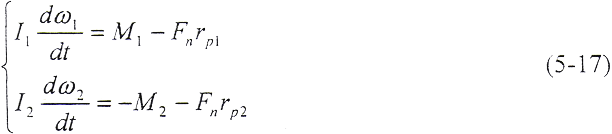 如果在t=0的瞬時,由于干擾載荷的作用,輪齒的變形量增大△δ,則齒上的載荷也獎增加△Fn,當轉矩M1、M2為定值時,由齒輪的平衡條件可知,齒輪的角速度ω將發(fā)生周期性變化,而載荷和變形也以同一頻率變化。由(5-17)式和(5-18)式,得