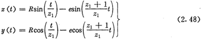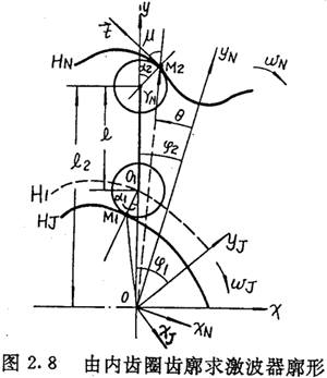 由上面可以看出,在選定激波器廓形TJ=TJ(θ)的情況下,正反兩種結構所得到的內(nèi)齒圈齒廓方程式(2.21)與式(2.22)在形式上是不同的。對于反向結構,用-θ代換激波器方程中的θ,即令TJ=TJ(-θ),則θ增加的方向為順時針方向,若激波器廓形可表示為偶函數(shù),即TJ(—θ)=TJ(θ),讓激波器按逆時針方向轉動,則所得的內(nèi)齒圈齒廓方程式完全與(2.21)式相同。因而齒廓方程式(2.22)與式(2.21)雖然形式不同,但實質是一樣的。區(qū)別在于參數(shù)吸的取值方向,今后以式(2.21)作為內(nèi)齒圈齒廓的標準形式。