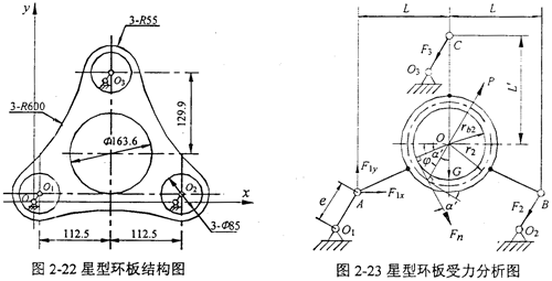 再次分析星型少齒差減速機的情況,圖2-22所示為星型減速機一塊環(huán)板的結構圖,它的受力情況和坐標系選取如圖2-23所示。