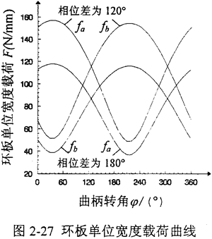 L1=145mm,L2=145mm,Z2=42,Z1=44,m=3.5mm,a=20°,a′=37.356°,T=875N·m,n=1440r/min,b1=b2=25mm。則環(huán)板左孔Ai單位寬度上的載荷fa、環(huán)板右孔Bi單位寬度上的載荷fb隨輸入曲柄轉角φ變化的曲線如圖2-27所示。