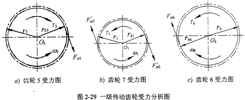 一級傳動齒輪受力分析如圖2-29所示,a)、b)、c)分別為分流齒輪5、主動齒輪7、分流齒輪6受力分析圖,二級傳動傳比