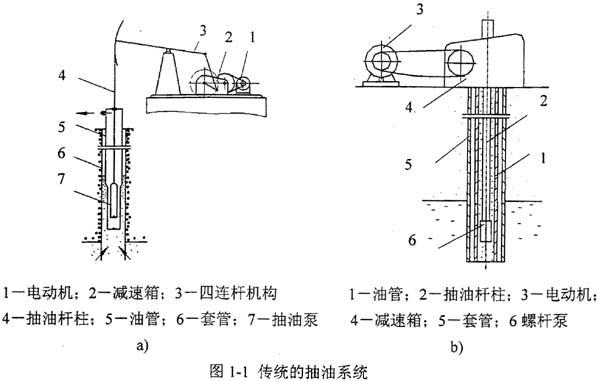 傳統(tǒng)的采油設備主要以游梁式抽油機(圖1-la)為主,其由三部分組成:一是地面部分-游梁式抽油機,包括電動機、減速箱和四連桿機構;二是井下部分-抽油泵,它懸掛在套管中油管的下端;三是聯(lián)系地面和井下的中間部分-抽油桿柱,它由一種或幾種直徑的抽油桿和接箍組成。游梁式抽油機的優(yōu)點是結構簡單、制造容易、維護方便,缺點是抽油泵排量太小,一般為50~100米3/天。而且該系統(tǒng)含砂敏感,地面驅動部分體積龐大。為了減輕抽油機的重量,人們又開發(fā)了無游梁式抽油機,它分為機械無游梁式抽油機和液壓無游梁式抽油機兩種。它們的共同特點是保留抽油桿和原來的抽油泵,維持有桿泵抽油設備的工作方式。無游梁式抽油機,特別是液壓無游梁式抽油機的采用,可以降低抽油桿中的應力和改善它的工作條件,因而擴大了有桿泵抽油設備的使用范圍。然而,無論是游梁式抽油機還是無游梁式抽油機,由于其抽油泵固有的結構特點,在抽取含砂、含氣、含水、含蠟、含膠質、含石膏的原油、稠油和低滲透層原油時,均無法滿足工作要求。