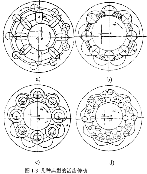 活齒傳動,全稱為“活齒少齒差行星齒輪傳動”,是一種由K-H-V 型少齒差行星齒輪傳動演化而成的一種新型齒輪傳動。它的特點是固定輪上的齒形制成圓弧或其他曲線,行星輪上的各輪齒改用單個的活動構件(如滾柱)代替,而這些構件分別置于輸出軸上沿周向分布的槽孔中,當主動偏心構件(波發(fā)生器)驅動時,它們將在槽孔中活動,故稱為“活齒”。常見的活齒傳動分為推桿活齒傳動(圖1-3a)、滾柱(鋼球)活齒傳動(圖1-3b)、套筒活齒傳動(圖1-3c)、擺動活齒傳動(圖1-3d)等;铨X結構形式最初是由德國人于30 年代提出的,40 年代德國將活齒傳動技術應用于汽車的轉向機構中。60 年代前后,美國、前蘇聯(lián)、英國、聯(lián)邦德國等國都先后開展了研究工作。前蘇聯(lián)研究了“柱塞傳動”(活齒傳動的一種型式),提出了它的運動分析和力分析的計算方法。美國學者提出了推桿活齒減速器傳動裝置,分析了傳動原理,對傳動比和作用力進行了計算,分析了其傳動性能。英國推出了“滑齒減速器”。80年代,前蘇聯(lián)學者HLHATHIIIeB.P.M推出了另一種活齒傳動形式即“正旋滾珠傳動”,并研究了正旋滾珠活齒傳動的嚙合理論、強度特性、走和性能等。前蘇聯(lián)還將正旋滾珠減速器用于石油鉆探中,成功地解決了渦輪鉆具轉速過高的難題。英國也曾對活齒傳動減速器進行了系列生產,單給傳動的傳動比為20~80,效率為86%~87%,也有雙級和三級傳動,功率N<25馬力。80年代才真正開始的,1986年北京航空學院陳仕賢教授提出了推桿活齒針齒輪減速機,其結構與樣機于同看獲日內瓦國際發(fā)明博覽會金獎。1987年,周有強教授等人提出了套筒活齒少齒差傳動并申報了國家專利。麻彪對套筒活齒少齒差傳動提出了一種改進的結構方案。1988年曲繼方教授提出了軸向活齒傳動的一種結構形式及齒形設計方法,同時提出了另一種新型活齒傳動裝置-擺動活齒減速機并申報國家專利。90年代,江陰東亞減速機廠的嚴明工程師提出了一種新結構活齒傳動-移位滾柱減速機,該項技術獲國家專利并在全國發(fā)明博覽會和北京國際博覽會上均獲得銀獎。此外,我國學者還獲得了滾道減速機(CN 86 200768U)、密切圓活齒傳動、變速傳動軸承(CN 85 200923U)等多種專利技術。