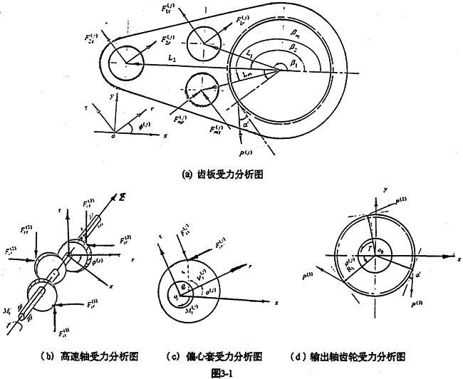由于多相并列內(nèi)齒行星傳動的N片行星齒板結(jié)構(gòu)相同,相鄰兩片之間的相位差為2Ω/N。因此,在一個(gè)周期范圍內(nèi),各片齒板的受力情況完全一樣,故只需分析其中一片齒板即可。齒板及高速軸、輸出軸的受力分析如圖3-1所示。用動態(tài)靜力平衡法寫出機(jī)構(gòu)的動力分析基本方程為