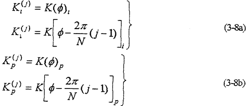 設(shè)偏心套與齒板之間的接觸變形剛度系數(shù)為K(j)i,內(nèi)嚙合齒對的變形剛度系數(shù)為K(j)P,它們除與構(gòu)件材料和幾何結(jié)構(gòu)有關(guān)外,還是機(jī)構(gòu)工況位置角φ(j)的周期函數(shù)。各相剛度系數(shù)之間的關(guān)系為