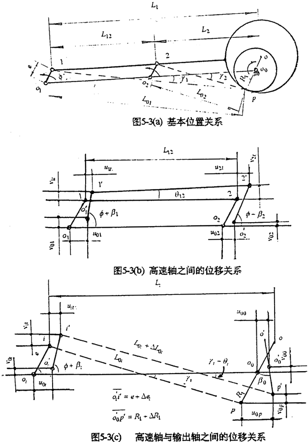 三環(huán)減速是多相并列連桿行星齒輪傳動(dòng)過約束機(jī)構(gòu)。應(yīng)該從整體系統(tǒng)上去考慮其變形關(guān)系。圖5-3是一相子機(jī)構(gòu)的位移關(guān)系圖。圖5-3(a)是基本位置圖、圖5-3(b)是高速軸之間的位移關(guān)系、圖5-3(c)是高速軸與輸出軸之間的位移關(guān)系(i=1、2)。由圖寫出各運(yùn)動(dòng)副中心的位移關(guān)系如下: