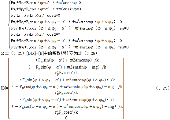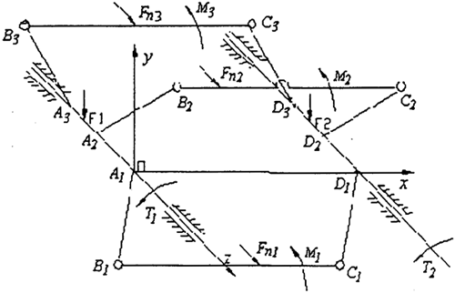 共可列出10個方程,聯(lián)立式(3-10)或(3-11),對于多相并列雙曲柄結(jié)構(gòu),用一般靜態(tài)力學(xué)分析方法,可列出3n+10個方程,而未知量的總數(shù)為4n+9(運動副反力和輸入力矩),故機構(gòu)中未知量,(n-1)正是機構(gòu)中的虛約束個數(shù),為了得到補充方程,必須考慮構(gòu)件的變形協(xié)調(diào)要求。