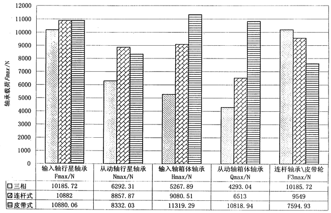 表3.5給出了不同形式的平行軸擺線針輪減速的軸承最大載荷,其中三相是指相位差均等為120的三環(huán)平行軸擺線針輪減速器。由表和圖3.20可知:連桿式和皮帶式的輸入軸行星軸承的最大載荷比三相的大約7%,而連桿式與皮帶式非常接近;對于輸入軸箱體軸承的最大載荷,皮帶式的最大,比連桿式的高約25%,比三相高級我110%。由此可見連桿式平行軸擺線針輪減速的承載能力比皮帶式強(qiáng),比三相的略優(yōu)。