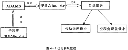 上已述及,擺線輪修形方式及修形量的選擇對RV減速器傳動誤差及空程角誤差的影響很大,因此進行優(yōu)化分析應(yīng)將傳動誤差及空程角誤差作為目標(biāo)函數(shù),而將移距修形量△Rz及等距修形量△r作為設(shè)計變量,且△Rz與△r的正、負(fù)號表明了修形方式,子程序又是建立擺線輪的通用齒廓方程,通過ADAMS對子程序的調(diào)用,就可得到最優(yōu)的修形組合。具體的實現(xiàn)過程如下圖所示: