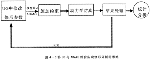 前面已經(jīng)以擺線傳輸線的參數(shù)化建模為例,闡述了UG的強大的基于特征的參數(shù)化造型功能,既然用子程序的方式實現(xiàn)不了,將UG的該功能加以充分利用,也可以實現(xiàn)優(yōu)化修形的目的。實現(xiàn)的途徑是在建造擺線輪的表達式中考慮修形量△Rz與△r,這樣就建造了修形后的擺線輪,同時△Rz與△r是隨機可調(diào)的變量,可以得到任意組合的修形方式。并且UG的數(shù)據(jù)存儲具有單一數(shù)據(jù)庫的特點,零件圖中修改后,裝配圖及工程圖全都自動更新,不用人工去費時修改。然后,再將總裝配模型導(dǎo)入到ADAMS中施加約束。執(zhí)行仿真。這樣就得到多組修形組合的仿真結(jié)果,經(jīng)過統(tǒng)計分析就可得到最佳的修形組合。具體思路如下圖所示。