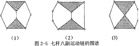 對于(5,5)來說,只有一種連接方式,作為一種混合動力驅(qū)動系統(tǒng)已有人做過研究,在本論文中,不能滿足設(shè)計要求,因此不可。欢9,11)及以上又有40個(或更多)運動鏈之多,且構(gòu)件多結(jié)構(gòu)復雜,研究起來非常困難,暫不考慮;先考慮(7,8)七桿八副機構(gòu),其構(gòu)建數(shù)量不是太多,結(jié)構(gòu)不是太復雜,共有3個運動鏈(如圖2-5),特定化后又有11種(排除同構(gòu)的機構(gòu))特定化導出機構(gòu),可以從中選擇可能適合的方案,因此以下將對(7,8)來詳細分析研究。