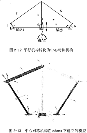 這種平行桿機構(gòu)理論上正確,但是實際上運行時會產(chǎn)生奇異,不能實際采用,因此轉(zhuǎn)化為如圖2-12所示的這種中心對稱的連桿機構(gòu)。并在adams軟件下建立了模型如圖2-13,經(jīng)分析認為該機構(gòu)完全對稱的結(jié)構(gòu)特征,更適合于一般情況下的速度等速傳遞,不適合在沖壓工況下應(yīng)用,所以這種結(jié)構(gòu)也決定不采用。