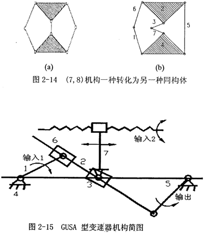 方案三:在眾多已有機構(gòu)類型篩選當中,發(fā)現(xiàn)機構(gòu)式脈動無級變速器中的一種:三相并列連桿式(GUSA)脈動無級變速器采用的機構(gòu)可以供鑒。這咱變速器設(shè)計原理為:采用三相并列結(jié)構(gòu),作為輸入機構(gòu)的是相位差為120度的三曲拐曲軸,每個曲拐帶動一套Ⅲ級七桿機構(gòu),如圖所示是(7,8)圖譜中(1)的一種同構(gòu)機構(gòu),圖2-14顯示了它的轉(zhuǎn)化和各桿件的標號,可以與圖2-15結(jié)構(gòu)簡圖——對應(yīng)。