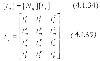 矩陣內(nèi)項(xiàng)表示分布力在單元角點(diǎn)l,m,n,k上沿x,y ,z的分量。對于一個單元有