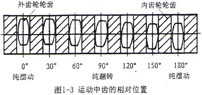 鼓形齒聯(lián)軸器的運(yùn)動(dòng)狀態(tài)是復(fù)雜的空間運(yùn)動(dòng)。現(xiàn)有資料均把它簡(jiǎn)化為展開的平面運(yùn)動(dòng)進(jìn)行分析,在有軸間傾角的狀態(tài)下,將運(yùn)動(dòng)分為齒的擺動(dòng)運(yùn)動(dòng)和翻轉(zhuǎn)運(yùn)動(dòng)。這兩種運(yùn)動(dòng)在嚙合半周中經(jīng)歷純擺動(dòng)—復(fù)合運(yùn)動(dòng)—純翻轉(zhuǎn)—復(fù)合運(yùn)動(dòng)—純擺動(dòng)的循環(huán)運(yùn)動(dòng)過程,如圖1-3所示。純擺動(dòng)—純翻轉(zhuǎn)的相位差為90°。在非純擺動(dòng)和純翻轉(zhuǎn)運(yùn)動(dòng)過程中,內(nèi)外齒的相對(duì)運(yùn)動(dòng)是擺動(dòng)運(yùn)動(dòng)和翻轉(zhuǎn)運(yùn)動(dòng)的復(fù)合運(yùn)動(dòng)[68]。顯然這種簡(jiǎn)化分析方法是很粗略的,無法確切地描述空間嚙合狀態(tài),但是它對(duì)于分析齒向位移、棱邊卡死現(xiàn)象及說明某一輪齒所處周向位置是有意義的。