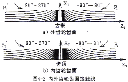 由(4-1-10)式和式(4-1-12)式通過計(jì)算,可以得到內(nèi)外齒輪齒面上接觸線坐標(biāo),由計(jì)算出的坐標(biāo)值即可繪出接觸線圖形。
