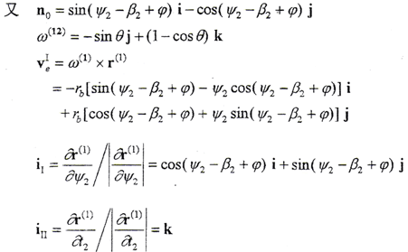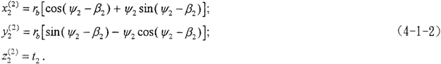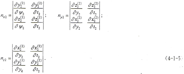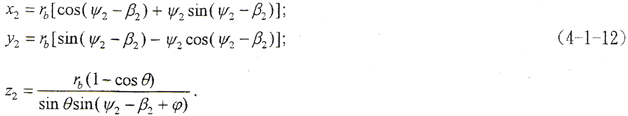 (4-1-9)式中,φ1、φ2為二齒面的轉(zhuǎn)角,令φ1=φ2=φ,將(4-1-2)式及由(4-1-8)式解出的t2代入(4-1-9)式,即可得到以ψ2、φ為參變量的外齒輪齒面方程。