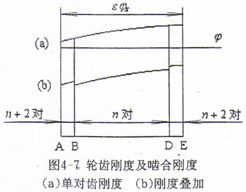 嚙合過程中,n對(duì)齒與n+2對(duì)齒交替嚙合,剛度疊加,如圖4-7(b)所示。由嚙合剛度的定義知