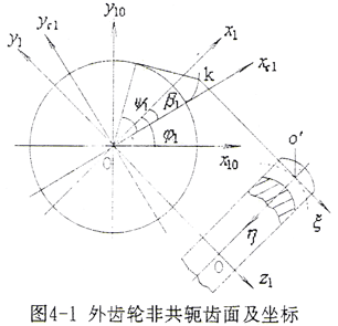 外齒輪齒面及坐標(biāo)系如圖4-1所示。此處只討論在平行于端面的各截面上,為不同變位系數(shù)的漸開線外齒輪。