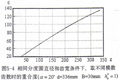 鼓形齒聯(lián)軸器的齒數(shù)模數(shù)決定了其徑向結(jié)構(gòu)尺寸大小。對于優(yōu)化鼓度曲線的鼓形齒聯(lián)軸器,其嚙合特性與共軛齒面鼓形齒聯(lián)軸器相近,因此我們可以依據(jù)共軛齒面鼓形齒聯(lián)軸器特性來考慮齒數(shù)模數(shù)的參數(shù)優(yōu)化問題。圖5-4給出了相同齒輪分度圓直徑和齒寬條件下取不同模數(shù)齒數(shù)時(shí)的重合度曲線,從曲線可以看出相同齒輪分度圓直徑和齒寬條件下,所取齒數(shù)越多,則重合度越大。重合度越大,平均每對齒承受的載荷越小,多齒嚙合過渡狀態(tài)載荷分配的變化量越小,傳動越平穩(wěn)。因此總的模數(shù)齒數(shù)的選取原則是盡可能選大的齒數(shù)。但是相同齒輪分度圓直徑條件下,齒數(shù)越大,模數(shù)越小。模數(shù)的減小將降低齒根彎曲強(qiáng)度;另外,由齒面接觸線形態(tài)知,模數(shù)的減小也將降低齒面接觸強(qiáng)度。為保證有足夠的齒根彎曲強(qiáng)度和齒面接觸強(qiáng)度,應(yīng)由所傳遞的轉(zhuǎn)矩和許用應(yīng)力值,先計(jì)算出所允許的最小模數(shù),再根據(jù)這個(gè)模數(shù)值及分度圓直徑來確定齒數(shù)。由于使用中磨損是不可避免的,因此,選取模數(shù)時(shí)還應(yīng)考慮輪齒齒厚有一定的裕量,保證在一定的磨損程度下仍有足夠的強(qiáng)度。另外,模數(shù)的選取還應(yīng)考慮工藝條件的許可。這些內(nèi)容包含較多的經(jīng)驗(yàn)成份,在此不予詳細(xì)討論。
