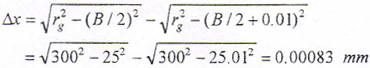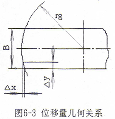 位移傳感器根據(jù)運(yùn)動(dòng)的型式不同分為直線位移傳感器和角度位移傳感器,直線位移傳感器常見的有光柵位移傳感器、感應(yīng)同步傳感器等,它們可以直接安裝在所測(cè)直線運(yùn)動(dòng)部件上,無傳動(dòng)誤差影響,精度高。但是由于結(jié)構(gòu)的原因,它們需要非常精確的安裝基準(zhǔn)和合適的安裝空間,且通常情況下安裝定位較困難。由于光柵的密封性較差,光柵材料較脆弱,所以它們的抗污染性能和抗振性能也較差,而且所需防護(hù)裝置也較復(fù)雜,成本較高。角度位移傳感器最常用的有光電編碼器,它具有精度高,體積小,安裝方便、密封性好、抗污染和抗振性能好等優(yōu)點(diǎn)。本設(shè)計(jì)需測(cè)刀架的位移,在刀架上,切削冷卻潤滑油、切屑及粉塵的飛濺較嚴(yán)重,且不易設(shè)置防護(hù)裝置。如果采用光電編碼器需通過檢測(cè)絲桿的角位移間接檢測(cè)刀架的直線位移,但絲桿及傳動(dòng)機(jī)構(gòu)具有的傳動(dòng)精度和位移檢測(cè)精度是足夠的。另外,加工鼓形齒輪時(shí),形成鼓度曲線的實(shí)際切削位置通常在曲線較陡的范圍,例如加工圓弧鼓度曲線,幾何關(guān)系見圖6-3,設(shè)位移圓半徑rg=300mm,齒寬B=50mm,當(dāng)Δy=0.01mm,則