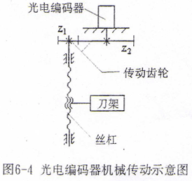 由于機(jī)床的刀架進(jìn)給絲桿的位置及結(jié)構(gòu)關(guān)系,通常不能將光電編碼器直接聯(lián)接在刀架進(jìn)給絲桿的端頭,需將絲桿的旋轉(zhuǎn)運(yùn)動(dòng)通過一對(duì)齒輪傳至光電編碼器。機(jī)械傳動(dòng)示意圖如圖6-4所示。