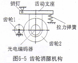 普通滾齒機(jī)具有刀架進(jìn)給絲桿的消隙機(jī)構(gòu),因此絲桿正反轉(zhuǎn)無間隙。齒輪的安裝有側(cè)隙存在,為了消除側(cè)隙對(duì)位移檢測(cè)影響,采用彈簧消隙機(jī)構(gòu),機(jī)構(gòu)簡(jiǎn)圖如圖6-5所示。光電編碼器安裝在活動(dòng)座上,其軸上裝有齒輪2,齒輪1與刀架進(jìn)給絲桿固連,活動(dòng)支座在彈簧作用下繞銷釘轉(zhuǎn)動(dòng),壓迫齒輪2與齒輪1使其無側(cè)隙。由于光電編碼器的驅(qū)動(dòng)力矩非常小,因此所需的彈簧的拉力也很小,不會(huì)對(duì)光電編碼的正常工作造成不良影響。