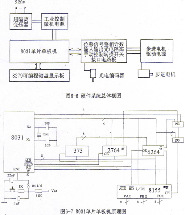 數(shù)控硬件由8031、外擴(kuò)一片程序存貯器芯片2764、外擴(kuò)一片數(shù)據(jù)存貯器6264和外擴(kuò)一片通用可編程并行輸入/輸出接口芯片8155、總線、片選擇碼電路、采用8279芯片的通用鍵盤顯示電路和位移鑒相輸入及驅(qū)動(dòng)輸出的接口電路組成。數(shù)控系統(tǒng)的現(xiàn)場(chǎng)抗干擾性能直接關(guān)系到整個(gè)系統(tǒng)的成敗。在硬件方面,為了防止強(qiáng)電電網(wǎng)的電壓尖峰和毛刺對(duì)系統(tǒng)的干擾,采用抗干擾能力強(qiáng)的工業(yè)用微機(jī)電源、超隔離變壓器、片選法譯碼電路、光電隔離電路。
