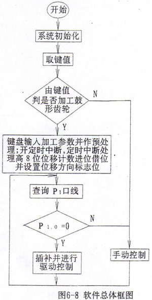 本系統(tǒng)的軟件采用模塊化設(shè)計(jì),主要包括系統(tǒng)初始化、數(shù)據(jù)輸入和顯示、插補(bǔ)運(yùn)算和驅(qū)動(dòng)控制、定時(shí)中斷處理位移信號(hào)、自動(dòng)與手動(dòng)控制等功能模塊。軟件總體框圖如圖6-8所示。