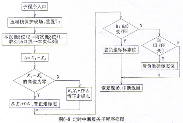位移脈沖計(jì)數(shù)的高8位的處理采用差值法,設(shè)前后兩次的低8位二進(jìn)制數(shù)為X1、X2,高8位二進(jìn)制數(shù)為B1、B2,先求差值△=X2-X1,若△的最高位為1,則此時(shí)整個(gè)16位計(jì)數(shù)的十六進(jìn)制數(shù)為B1X1+FF△;若△的最高位為0,則為B1X1+0△。相應(yīng)的,若△的最高位為1時(shí),當(dāng)前刀架向Y坐標(biāo)負(fù)方向運(yùn)動(dòng);若△的最高位為0時(shí),當(dāng)前刀架向Y坐標(biāo)正方向運(yùn)動(dòng)。而高8位由FFH變?yōu)?0H時(shí),當(dāng)前刀架位置在Y坐標(biāo)大于零;高8位由00H變?yōu)镕FH時(shí),當(dāng)前刀架位置在Y坐標(biāo)小于零,此時(shí)應(yīng)取Y坐標(biāo)補(bǔ)碼進(jìn)行插補(bǔ)運(yùn)算。定時(shí)中斷服務(wù)子程序框圖見圖6-9。