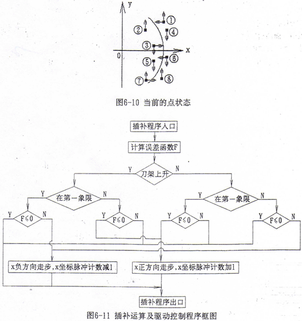 非圓弧曲線插補(bǔ)運(yùn)算時(shí),首先根據(jù)當(dāng)前的Y坐標(biāo)值及插補(bǔ)曲線f(x,y)=0,求解出x坐標(biāo)理論值xt,設(shè)當(dāng)前的實(shí)際x坐標(biāo)為xr,令誤差函數(shù)F=xr-xt。對(duì)圓弧曲線,根據(jù)當(dāng)前的x、y坐標(biāo),計(jì)算x2+y2值,令誤差函數(shù)F=x2+y2-R2。根據(jù)當(dāng)前點(diǎn)在不同象限、當(dāng)前刀架的運(yùn)動(dòng)方向及誤差函數(shù)的正負(fù),共有8種情況出現(xiàn)(如圖6-10所示),應(yīng)根據(jù)它們的狀態(tài)進(jìn)行不同的處理。①、⑥兩種情況應(yīng)使當(dāng)前點(diǎn)向x坐標(biāo)負(fù)方向走步;③、⑦兩種情況應(yīng)使當(dāng)前點(diǎn)向x坐標(biāo)正方向走步;②、④、⑤、⑧四種情況無需在x坐標(biāo)方向走步。由于在切齒過程中刀架的進(jìn)給速度較低,最高一般不超過30毫米/分鐘,兩次y坐標(biāo)計(jì)數(shù)脈沖間隔時(shí)間可達(dá)幾十毫秒,而插補(bǔ)運(yùn)算的時(shí)間不超過1毫秒,因此插補(bǔ)速度足夠。在刀架快速運(yùn)動(dòng)時(shí),插補(bǔ)有滯后,但此時(shí)不切削,這種滯后不影響加工。在插補(bǔ)過程中,顯示器輪流顯示當(dāng)前的x、y坐標(biāo)值,以利于操作者監(jiān)視加工情況,因此還需進(jìn)行顯示BCD碼的轉(zhuǎn)換和輪換的控制。插補(bǔ)運(yùn)算及驅(qū)動(dòng)控制程序框圖見圖6-11。