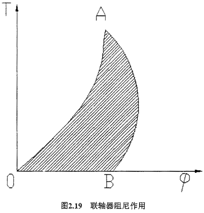 聯(lián)軸器的阻尼作用如圖2.19所示,聯(lián)軸器在工作過(guò)程中,加載和卸載的特性線(xiàn)不重合,所包圍的面積,OAB就代表阻尼所消耗的能量。