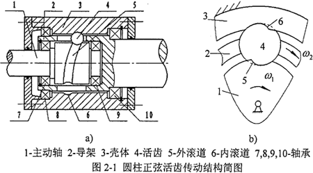 圖2-1所示為圓柱正弦活齒傳動機構(gòu)的結(jié)構(gòu)簡圖,圓柱正弦活齒傳動由主動軸、殼體、導架及活齒這四個部分組成。殼體的內(nèi)圓柱表面上有周期數(shù)為Z3的內(nèi)正弦滾道,軸承7、8、9、10支撐導架,導架圓周面上均勻分布著軸向活齒槽。軸承7、9支撐主動軸,其外圓柱面上有周期數(shù)為Z1的外正弦滾道,在內(nèi)滾道、外滾道及導架活齒槽的交錯區(qū)域內(nèi)安裝有球形活齒。