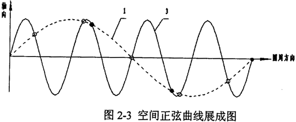 圓柱正弦活齒傳動在工作過程中,幾乎每個活齒都同時參與嚙合,活齒安裝在主動軸與殼體正弦滾道的交叉點處,活齒的安裝位置限制了活齒的數(shù)目n。將空間正弦曲線沿圓柱直母線方向展成平面正弦曲線,如圖2-3所示,其中1線為主動軸正弦滾道曲線,3線為殼體正弦滾道曲線。設(shè)正弦曲線切線的斜率有正負之分,則兩條正弦曲線相交,交點可以分為兩類:一類交點指在交點處兩正弦曲線的切線斜率同號(如圖中黑點所示);二類交點指在交點處兩正弦曲線的切線斜率異號(如圖中白圈所示)。若要求圓柱正弦活齒傳動的輸入輸出為同向傳動時,活齒應安放在二類交點處,此時活齒的個數(shù)為n=Z1+Z3;若輸入、輸出為反向傳動時,活齒應安放在一類交點處,此時活齒的個數(shù)為n=|Z1-Z3|。并保證,n≥3。