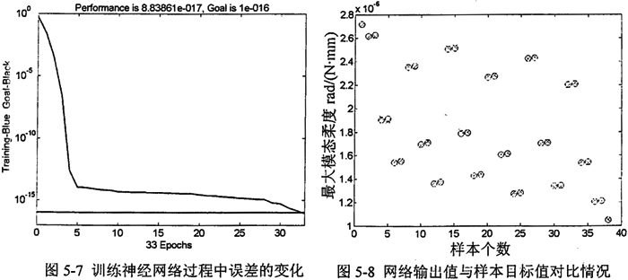 進(jìn)行動(dòng)態(tài)優(yōu)化時(shí),若要建立起目標(biāo)函數(shù),首先要獲得一組能夠精確計(jì)算f4(x)的權(quán)值,這就需要通過(guò)樣本訓(xùn)練BP神經(jīng)網(wǎng)絡(luò),當(dāng)誤差精度達(dá)到要求時(shí),訓(xùn)練停止,并得到了該組權(quán)值,利用該組權(quán)值與設(shè)計(jì)變量通過(guò)三層BP網(wǎng)絡(luò)可以計(jì)算出訓(xùn)練后的分目標(biāo)函數(shù)值f4(x)。在訓(xùn)練神經(jīng)網(wǎng)絡(luò)時(shí),學(xué)習(xí)速率取為0.01,動(dòng)量常數(shù)取為0.9,目標(biāo)誤差取為l×10-16。當(dāng)訓(xùn)練結(jié)束時(shí),網(wǎng)絡(luò)輸出值與樣本目標(biāo)值之間的誤差均方根值為8.8386×l0-17(見圖5-7),訓(xùn)練過(guò)程誤差的變化情況及訓(xùn)練完成后網(wǎng)絡(luò)輸出值與樣本目標(biāo)值對(duì)比情況如圖5-8所示。