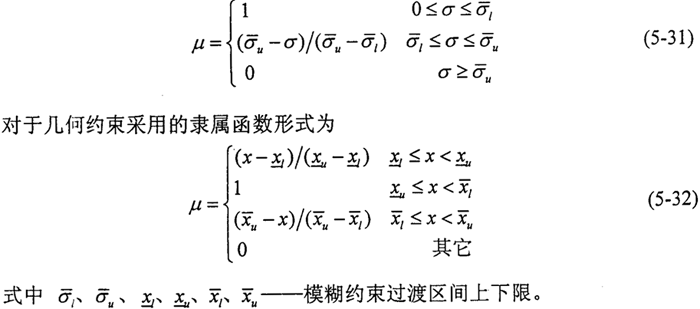 5.4.3.2隸屬函數(shù)及容差的確定 模糊約束的隸屬函數(shù),應(yīng)根據(jù)約束的性質(zhì)來(lái)具體確定,為簡(jiǎn)便計(jì)算,本文均采用線性嫦娥屬函數(shù),對(duì)于性能約束采用的隸屬函數(shù)形式為