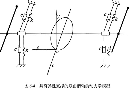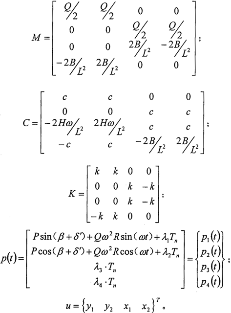 設(shè):彈性支撐的剛度和阻礙尼分別為k和c,輸出軸與曲柄和平衡塊構(gòu)成的轉(zhuǎn)子的主中心軸慣性矩為H,赤道慣性矩為B,質(zhì)量為Q,R為中心對回轉(zhuǎn)軸線的偏心距,L中心到支撐點(diǎn)的距離,左右彈性支撐上相應(yīng)兩點(diǎn)的坐標(biāo)分別為y1,x1和y2,x2。λ1,λ2,λ3,λ4為載荷分配不均勻的影響系數(shù),可由均載試驗(yàn)的結(jié)果或力平衡方程求得,若均載效果好,均載系數(shù)接近1,λ1,λ2,λ3,λ4的值近似為0。