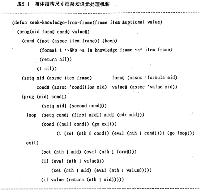 最后,測試取值條件(value)側(cè)面,若對取值有限制,則檢驗所計算值是否滿足紅束條件;如對delta值的限制,若delta≤8,則取delta=8。對箱體知識的求值過程的LISP函數(shù)如表5-1: