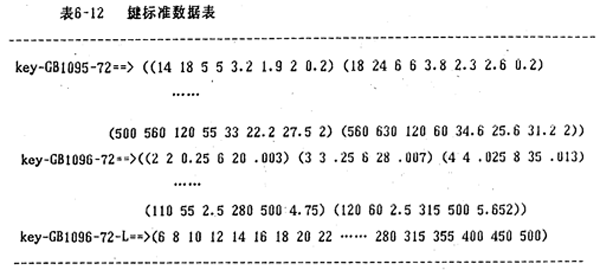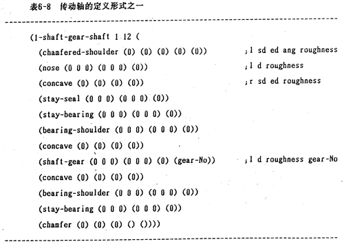 軸的結(jié)構(gòu)通常為階梯軸,階梯的級數(shù)以及各階梯的直徑和長度,應(yīng)綜合考慮軸上零件和裝配固定形式,軸的加工工藝性等因素進行設(shè)計,階梯數(shù)以易于安裝,同時減少加工次數(shù)為主要原則。通過大量統(tǒng)計分析分類,系統(tǒng)采用七種軸的結(jié)構(gòu)形式,分別用框架表示。表6-8其中一類軸的定義形式。其中,表中主要內(nèi)容:12為段數(shù),chatnfered-shoulder、…,nose、…分別為軸段特性、尺寸、加工特性等,第九行中的shaft-gear為連軸式齒輪,最后一列的gear-No為該齒輪的編號,可以作為索引查詢到該齒輪的參數(shù)。在確定尺寸時,某類軸的形式有時會發(fā)生變化。例如,階梯軸某一段長度為零時,這一階梯軸段便在設(shè)計圖紙上消失。