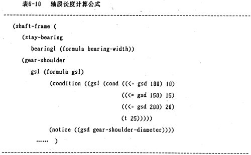 箱體結(jié)構(gòu)及尺寸設(shè)計完成后,便可進行傳動軸結(jié)構(gòu)參數(shù)長度的設(shè)計計算。軸的各段長度,決定于軸上零件的寬度,零件間的相對位置,傳動布置,箱體尺寸以及安裝要求等。傳統(tǒng)的設(shè)計方法是根據(jù)草圖進行設(shè)計,專家系統(tǒng)則要求精確的數(shù)值計算。軸段長度的計算是通過其知識框架和嵌套在框架中的過程知識進行,如表6-10所示。過程知識主要用于非規(guī)律性知識的求值。在計算時,§6.8中定義的軸的結(jié)構(gòu)有時會發(fā)生變化,這主要表現(xiàn)在