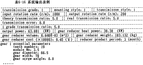 圓柱齒輪減速器設(shè)計完成后,其結(jié)果為一系列表(LISP 語言形式)組成的結(jié)果。為了使專家系統(tǒng)的結(jié)果方便地被用戶所理解,系統(tǒng)設(shè)置有相應(yīng)的輸出函數(shù),并以表格的形式,輸出所需的設(shè)計數(shù)據(jù)。下表(表6-16)為專家系統(tǒng)設(shè)計的一一級圓柱齒輪減速器的示例。