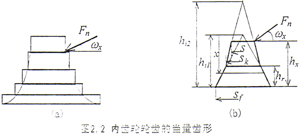 本文將輪齒的齒廓劃分為二個梯形,用二個梯形的彎曲變形、剪切變形、由輪齒基體的彈性傾斜所引起的輪齒的的變形以及輪齒的材料壓縮變形來模擬內(nèi)齒的輪齒變形,故稱之為二梯形當(dāng)量齒形法。這樣處理與Marmol的方法相比更接近實際的齒廓形狀,而且與外嚙合輪齒的梯形加矩形模型正好對應(yīng)。下面就介紹二梯形當(dāng)量齒形法,將內(nèi)齒輪輪齒劃分為上、下二個梯形,如圖2.2b所示。