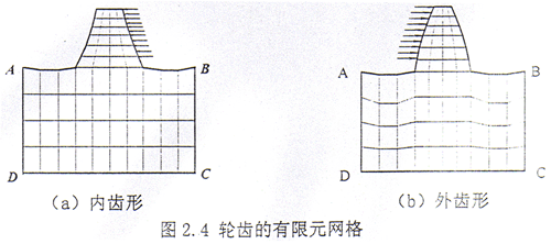 為了與上述方法進行數(shù)值比較,在此對內(nèi)、外齒輪的輪齒進行有限元法分析。輪齒的有限元網(wǎng)格劃分見圖2.4,輪齒網(wǎng)格的輪廓盡量模擬自然邊界?紤]到彈性基座的傾斜對柔度的影響較大,因此本文取AB=6m,AD=3.25m(m是齒輪的模數(shù))。載荷的分布與齒對的接觸情況有關(guān),對于齒輪聯(lián)軸器齒面接觸比較特殊。本文將載荷均勻地分布于工作齒面上。節(jié)圓處的切向柔度為qt,相應(yīng)的法向柔度[89]q=qtcos2α。計算結(jié)果見表2.3.