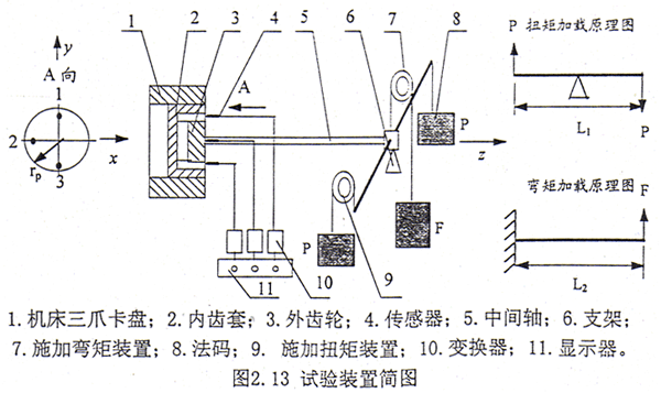 齒輪聯(lián)軸器的內(nèi)齒套固定在一個(gè)三爪卡盤上,聯(lián)軸器的外齒輪插入內(nèi)齒套與之相嚙合。采用3個(gè)電渦流傳感器,傳感器的布置見圖2.13,試驗(yàn)臺(tái)的實(shí)拍照片見圖2.14。中間軸的一端與外齒輪固接,而另一端則用于施加扭矩和施加繞X方向的彎矩。扭矩和彎矩的大小由法碼的重量和桿或軸的長(zhǎng)度來(lái)確定。作用于聯(lián)軸器上的扭矩