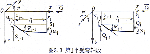 其中 Sj-1,Mj-1,Nj-1,Sj,Mj,Qj,Nj分別為作用于第j-1、j個(gè)結(jié)點(diǎn)處軸截面上的剪力和彎矩,根據(jù)平衡方程則第j個(gè)軸段在x方向