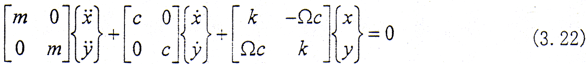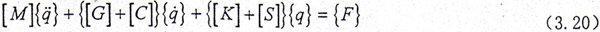 在式(3.20)中,[M],[C],[K]分別為整體系統(tǒng)的廣義質(zhì)量、阻尼和剛度矩陣,這三個(gè)矩陣是對稱陣;而[G]是陀螺力陣,[S]是廣義循環(huán)力(或稱之為廣義約束阻尼力)陣,這二個(gè)矩陣是反對稱陣;{F}為外激振力陣。
