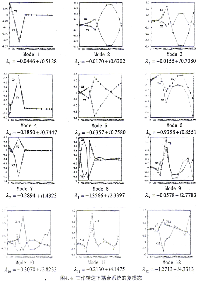 通過齒輪聯(lián)軸器耦合后的轉(zhuǎn)子系統(tǒng),在上述給定的轉(zhuǎn)速范圍內(nèi),共為12階模態(tài),如圖4.4所示,比耦合前多了2階。這表明耦合后在上述轉(zhuǎn)速范圍內(nèi)模態(tài)數(shù)目發(fā)生了變化。耦合系統(tǒng)的模態(tài)可以分為兩類:(1)第一類為耦合成分很小的振動,例如Mode1、Mode4、Mode7、Mode8,這4階幾乎完全表現(xiàn)為G軸的振動,電機軸的振動很小。但是從模態(tài)圖上來看又不能與耦合前單個G軸的4階模態(tài)相對應(yīng),主要表現(xiàn)為與齒輪聯(lián)軸器相連接的G軸的外伸端在耦合前上述4階的振動很大,而在耦合后振動受到很大的抑制,振動很小。從復(fù)特征值來看,無論是反應(yīng)系統(tǒng)衰減快慢的實部,還是反映系統(tǒng)自然振動頻率的虛部都有不小的變化。如果將上述4階對應(yīng)的復(fù)特征值作一比較,那么其中耦合后的虛部值總是大于耦合前的對應(yīng)值。其主要原因是在耦合后將G軸和電機軸作為一個整體系統(tǒng)來考慮,此時相當于將電機軸看作是對G的一個約束,這一約束直接作用于外伸端,使得G軸外伸端的振動減小,同時使得G軸的自然頻率增大。因此傳統(tǒng)上在計算DH機組的動態(tài)特性時,強行將G軸和電機軸分開,而只考慮其中的G軸,僅從這4階模態(tài)和復(fù)特征值上進行分析也會產(chǎn)生較大的偏差。(2)第二類為G軸和電機軸之間的耦合模態(tài),在這8階模態(tài)中G軸和電機軸的振動非常明顯,這表明如果將G軸和電機軸在齒輪聯(lián)軸器處分開處理,僅計算G軸的振動,而不考慮電機軸的影響,那么上述8階模態(tài)會全部被漏掉,因此這樣處理會丟失一些非常重要的低頻信息。在文獻[18]中,由于未考慮電機軸的作用,因此與電機軸有關(guān)的模態(tài)信息就不出現(xiàn)。如果從這8階復(fù)特征值前6階的數(shù)值來看,那么都能從耦合前電機軸的6階模態(tài)中找到,而且低階特征值的實部和虛部變化均不大。這說明如果僅分析電機軸的振動,那么將G軸忽略掉,倒能得到較好的近似。從直觀上看,將G軸與電機軸相比,其質(zhì)量和幾何參數(shù)要小許多。如果將G軸看成是電機軸的約束,那么這一約束比電機軸對G軸的約束自然要弱得多。因此從這一意義上來說G軸對電機軸的影響沒有電機軸對G軸的影響大。綜上所述,耦合后電機軸對G軸的影響較大,而G軸對電機軸的影響較小。在實際工程中,象DH這樣的機組曾發(fā)生電機振動過大的現(xiàn)象[9],因此如果不將G軸、電機軸和齒輪聯(lián)軸器作為整體一起進行分析而在齒輪聯(lián)軸器處強行分開只分析G軸的振動就顯得極不合適。