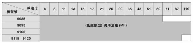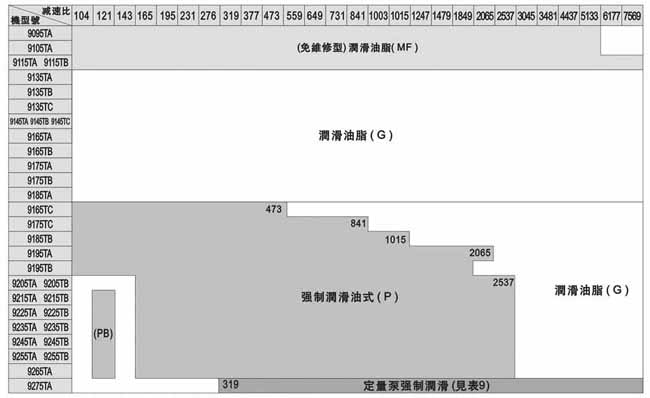 注:此表所列為輸入轉(zhuǎn)速為標(biāo)準(zhǔn)轉(zhuǎn)速情況下,標(biāo)準(zhǔn)潤滑方式。