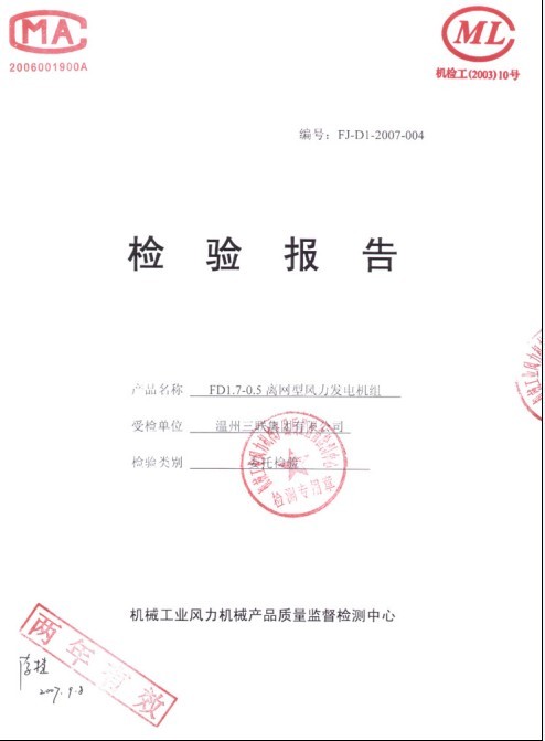 發(fā)證機構(gòu):機械工業(yè)風力機械產(chǎn)品質(zhì)量監(jiān)督檢測中心