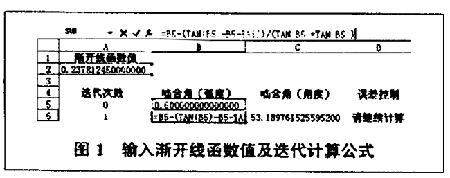 如圖1 所示,選取任意單元格(圖l中為B5 ) 輸人初始值(本例αo = 0.6 ),用迭代公式(5)在單元格B6 中輸人迭代計(jì)算公式:= B5-(TAN(B5)-B5-$A$2)/(TAN(B5)*TAN(B5))確認(rèn),在單元格C6 中輸人弧度值換算角度值公式:= B6*180/PIO 確認(rèn),在單元格D6中輸人誤差控制表達(dá)式:=IF(ABS( B5-B6)<10^(-7), “終止計(jì)算”, “請(qǐng)繼續(xù)計(jì)算”)確認(rèn):
